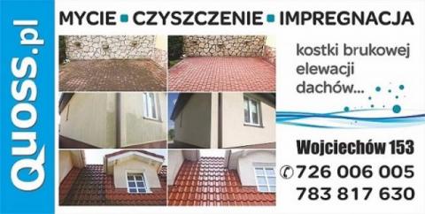 CZYŚCIMY, MYJEMY, IMPREGNUJEMY kostkę brukową, elewacje, dachy oraz inne zanieczyszczone powierzchnie •ODGRZYBIAMY ściany, elewacje, sufity, garaże •MALUJEMY dachy oraz inne powierzchnie •ODNAWIAMY balustrady, ogrodzenia i inne. Stosujemy specjalistyczny sprzęt oraz środki o uznanej marce spełniające najwyższe normy czyszczenia i impregnacji. Zachęcamy do korzystania z naszych usług oraz odwiedzenia strony www.quoss.pl Quoss [kłos] usługi specjalistycznego czyszczenia, WOJCIECHÓW, tel. 726-006-005