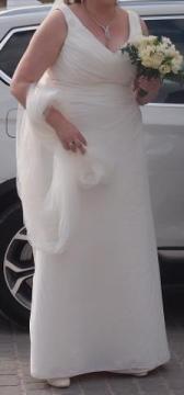 Szanowne Panie mam do sprzedania klasyczną suknię w kolorze mlecznym. Została zakupiona w salonie ślubnym Madonna w Warszawie. Suknia została użyta jednokrotnie, jest w stanie idealnym, po profesjonalnym czyszczeniu i prasowaniu. Posiada podpinany tren, jest zapinana na kryty zamek. Delikatna, elegancka, lekka, bardzo oryginalna i idealnie podkreśla figurę i tuszuje jej niedoskonałości. Dekolt w kształcie litery V z przodu i z tyłu idealnie podkreśla biust, a całej sukni nadaje lekkości. Suknia w rozmiarze uniwersalnym szyta na miarę na wzrost 185 cm. Niewątpliwie każda Panna Młoda będzie się w niej czuła wyjątkowo!