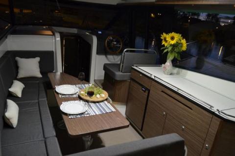989 Platinum to pierwszy pół-ślizgowy jacht z kokpitem salonowym, na którym przestrzeń została podzielona na strefę dzienną i nocną. Salon z hardtopem otoczony panoramicznymi oknami zamykanym kambuzem z pełnym wyposażeniem, wygodną wielką kanapą z bakistami, stołem oraz podwójnym stanowiskiem sterowniczym stanowi przestrzeń dzienną. Całość jest otwarta na kokpit z platformami kąpielowymi podczas słonecznych chwil. Zamknięcie części dziennej jak i jachtu stanowią