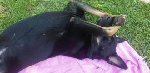 Zuzia jest mega wesołą i aktywną sunia. W DT uczy się wszystkiego od nowa, mieszka z 2 psami.