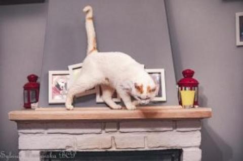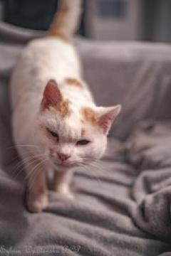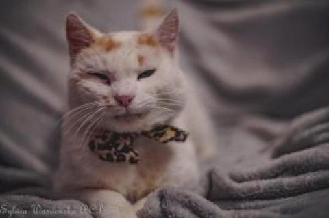 Zupełnie dziki” kocur złapany na działkach do kastracji. Okazało się, że ma chore oczko, którego raczej nie da się wyleczyć.. trzeba będzie usunąć. Ten „dzikus” już po dwóch dniach wyszedł zza kanapy i władował się na kolana.. łasi się, mruczy, przychodzi na wołanie. Jego wiek weterynarz określił na „uuuu …. trochę już ma”, więc bliżej nieokreślony . Po prostu 5 kilo białej, czystej, kociej miłości!