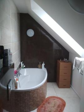 Góra: 2 pokoje, garderoba 10 m2, przestronna łazienka z oknem dachowym. Schody jesionowe. W oknach rolety dzień-noc, na podłogach panele i płytki włoskie. Instalacja centralnego ogrzewania.