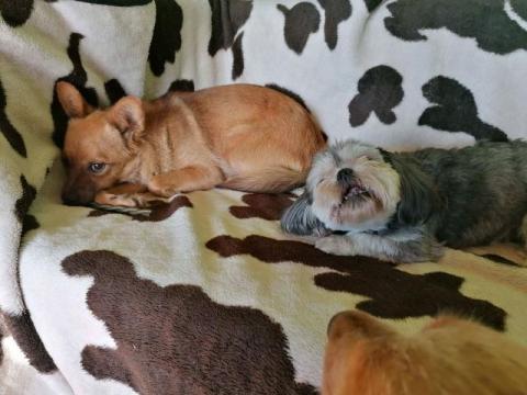 Całusek ma ok. 3 lat, toleruje psy i koty, chodzenie na smyczy nie stanowi problemu, zachowuje też czystość w domu.