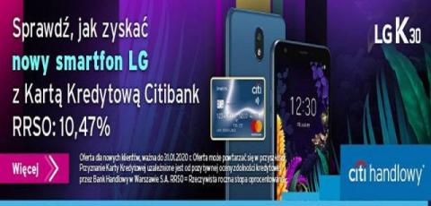 Kolejna odsłona promocji kart kredytowych Citi Banku - tym razem można zdobyć zupełnie za darmo smartfon LG "K30 Dual Sim LMX320EMW"!