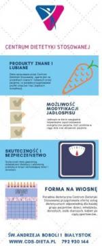 Centrum Dietetyki Stosowanej jest uznaną wśród pacjentów poradnią dietetyczną oferującą kompleksowe usługi dietetyczne w zakresie walki z nadwagą, leczenia otyłości oraz leczenia chorób dietozależnych u dzieci, młodzieży oraz dorosłych. Poradnia dietetyczna CDS mieści się przy ul. Św. Andrzeja Boboli 1 w Białymstoku, realizuje wizyty w poradni, wizyty domowe oraz konsultacje internetowe dla pacjentów, którzy nie mogą skorzystać z wizyty w poradni. Konsultacje z dietetykiem w Centrum Dietetyki Stosowanej umożliwiają opracowanie skutecznego planu dietetycznego, uwzględniającego potrzeby zdrowotne i oczekiwania pacjenta związane z opracowanym jadłospisem. Pomoc dietetyka w odchudzaniu stanowi najskuteczniejszą metodę odchudzania oraz zapewnia trwałe rezultaty diety odchudzającej z uwagi na dostosowanie zasad żywieniowych i zapotrzebowania energetycznego do potrzeb pacjenta, jego poziomu aktywności fizycznej, stylu życia oraz stanu zdrowia. Wizyta u dietetyka obejmuje analizę składu ciała, obszerny wywiad żywieniowy, konsultację medyczną uwzględniającą przebyte choroby, aktualnie występujące problemy zdrowotne, przyjmowane leki. Informacje udzielane w trakcie konsultacji dietetycznej pozwalają doświadczonemu dietetykowi na opracowanie skutecznej diety redukcyjnej, diety oczyszczającej, diety eliminacyjnej, leczniczej w zależności od potrzeb pacjenta. Porady dietetyczne udzielane w trakcie konsultacji z dietetykiem stanowią podstawę skutecznej i bezpiecznej dla zdrowia diety ponieważ uwzględniają wszelkie czynniki mające wpływ na rezultaty stosowanej diety. Zalecenia dietetyczne udzielane przez dietetyków CDS z wieloletnim doświadczeniem pozwalają na trwałą zmianę nawyków żywieniowych, a tym samym poprawę jakości życia, stanu zdrowia oraz uzyskanie wymarzonej sylwetki. Poradnia dietetyczna CDS opracowuje dla pacjentów diety pozwalające ograniczyć lub wyeliminować dolegliwości w przebiegu wielu chorób tj. cukrzyca, niedoczynność tarczycy, zespół jelita wrażliwego, insulinooporność, Hashimoto. Poradnia dietetyczna Centrum Dietetyki Stosowanej zapewnia opiekę dietetyka w trakcie stosowania diety, modyfikacje jadłospisu, możliwość konsultowania zmian w jadłospisie, dostosowanie jadłospisu do potrzeb całej rodziny. Odchudzanie z dietetykiem może stanowić podstawę procesu odchudzania lub stanowić jedynie wsparcie w odchudzaniu dla osób, które potrzebują jedynie edukacji żywieniowej, konsultacji w ustaleniu zapotrzebowania energetycznego, oceny postępów w odchudzaniu lub dostosowania diety do aktualnych potrzeb, w zależności od stanu zdrowia, aktywności życiowej czy sportowej. Specjaliści z zakresu zdrowego żywienia w Centrum Dietetyki Stosowanej stanowią ogromne wsparcie dla zawodowych sportowców, osób aktywnie uprawiających sport oraz osób, które podejmują starania o zdobycie sportowej formy. Wiosna to idealny czas na podejmowanie nowych wyzwań, zmianę nawyków żywieniowych oraz wizytę w poradni dietetycznej CDS, gdzie każdy znajdzie inspirację oraz wsparcie w budowaniu lepszej formy na wiosnę.