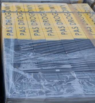 Wymiary; 12x10x100 cm, część nadziemna malowana na kolor żółty farbą chlorokauczukową do betonu z wytłoczonym napisem "PAS DROGOWY" pomalowanym na czarno farbą chlorokauczukową do betonu.