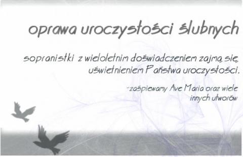 Sopranistki z wieloletnim doświadczeniem oraz pasją zaśpiewają Ave Maria i wiele innych utworów, uświetniając uroczystość Waszych zaślublin. Oferujemy zarówno partie solowe, jak i wykonania w duecie oraz tercecie.