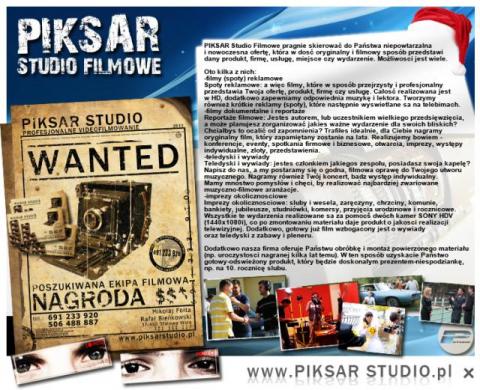 PIKSAR Studio Filmowe pragnie przedstawić Państwu szeroką ofertę związaną z realizacją video. Nasza praca opiera się na filmowaniu za pomocą dwóch kamer SONY HDV oraz nowoczesnym montażu. Dla Was nakręcimy wszystko - spoty reklamowe, teledyski, reportaże. Nie boimy się wyzwań. Ogrywamy zloty, spotkania biznesowe, konferencje, studniówki, śluby-wesela, imprezy urodzinowe i rocznicowe. Im bardziej zwariowane pomysły tym lepiej, jesteśmy bowiem młodzi i naszą pracę traktujemy z pasją, tak byś w przyszłości mógł otrzymać profesjonalny produkt filmowy. Zapraszamy na naszą stronę internetową i kanał YT - tam też dowiesz się o nas więcej.