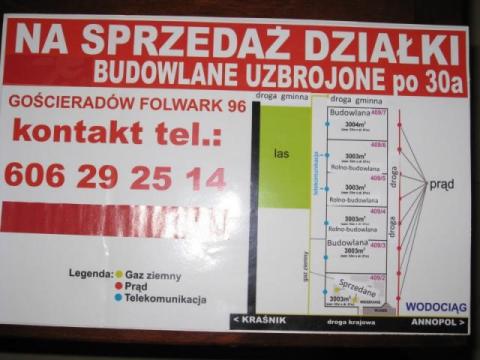 Sprzedam działki budowlane 3000m2 każda uzbrojone, prąd, gaz ziemny, telekomunikacja w granicach działek, wodociąg w odległości 100m. Działki położone w miejscowości Gościeradów - Folwark przy drodze krajowej K - 74 łączącej Lublin - Kielce a dokładniej Kraśnik - Annopol. Działki położone w sąsiedztwie osiedla domków jednorodzinnych w bliskiej odległości do lasu. Teren plaski, kształt prawie kwadrat. Działka 409/7 posiada określone warunki zabudowy (dom do 150m2 dwupoziomowy). Cena kazdej dziatki 50000zl. Zapraszam do obejrzenia.