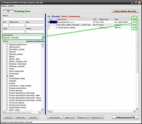 według: branży,miasta,województwa,kodu ,nazwy firmy.Aplikacja ułatwia wyszukiwanie rekordów.