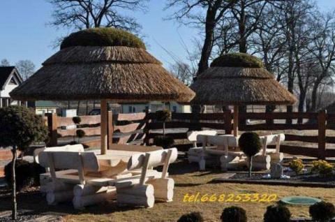 Całość wykonana jest na solidnej konstrukcji metalowej z 20cm pokryciem trzciną.Miejsca siedzące to komplet z bali na 8osób.