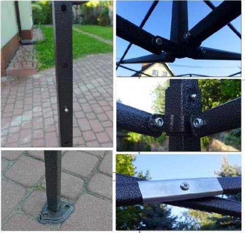 Namiot posiada stalową konstrukcję o wymiarach 3cm x 3cm. Posiada on budowę harmonijkową, dzięki czemu rozłożenie jest bardzo łatwe i zajmuje jednej osobie zaledwie 2 minuty. Dodatkowym atutem jest fakt, iż wszystkie elementy połączone są w jedną całość, dzięki czemu podczas przechowywania nie ma możliwości zagubienia elementów. Brak plastikowych połączeń, wszystkie są metalowe. Nogi konstrukcji namiotu posiadają bolce, które pozwalają regulować wysokość namiotu, natomiast stopy posiadają otwory, dzięki którym możemy go łatwo przymocować.