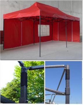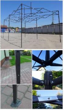 Namiot posiada stalową konstrukcję o wymiarach 30mm x 30mm. Posiada on budowę harmonijkową, dzięki czemu jego montaż jest łatwy i zajmuje tylko 2 minuty. Dodatkowo wszystkie elementy połączone są w jedną całość, dzięki czemu nie ma możliwości zagubienia elementów. Brak plastikowych połączeń, wszystkie są metalowe. Nogi konstrukcji namiotu posiadają bolce, które pozwalają regulować jego wysokość , natomiast stopy posiadają otwory, dzięki którym możemy go łatwo przymocować do podłoża.