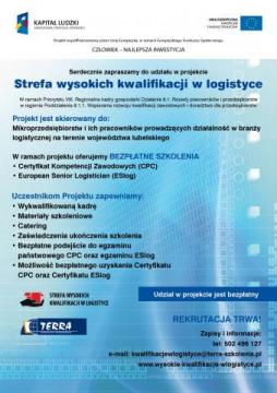 Do udziału w projekcie "Strefa wysokich kwalifikacji w logistyce" zapraszamy pracowników mikroprzedsiębiorstw prowadzących działalność w branży logistycznej na terenie województwa lubelskiego.