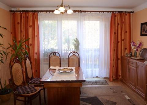 Na piętrze: 4 pokoje, łazienka i WC. Na parterze w pokojach panele, na piętrze deski, łazienki i WC- terakota. Pomieszczenia rozkładowe z energooszczędnymi oknami PCV. Łazienki w pełni wyposażone (wanny). Na każdej kondygnacji salon z wyjściem na balkon. Ogrzewanie przez oszczędny piec z automatycznym podajnikiem na ekogroszek lub na węgiel, woda użytkowa ogrzewana przez piec CO. Po adaptacji może służyć jako dom dwurodzinny.