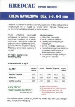 KREDCAL - Wapniak Rudkowski pochodzi ze złóż kredy piszącej znajdujących się w miejscowości Rudka koło KORNICY, niedaleko KOSZELÓWKI, dlatego odznacza się wyjątkową skutecznością odkwaszania. Można go stosować niemal przez cały rok, a w uprawach sadowniczych – nie ma potrzeby mieszania tego nawozu z glebą, (co jest konieczne w przypadku innych nawozów wapniowych)Świadectwo kwalifikacji produktu do stosowania w rolnictwie ekologicznym wzbogacone o mikroelementy cena za tone 480zl DOSTAWA GRATIS!