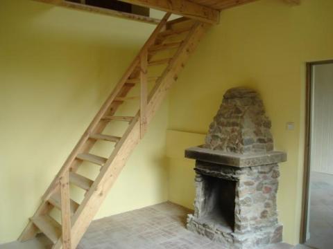 Na parterze w części mieszkalnej jest przedpokój , łazienka , kuchnia i pokój - z którego jest wejście ( po schodach ) na poddasze - obecnie otwarte które można podzielić na dowolne pomieszczenia . W przedpokoju , łazience i kuchni jest ogrzewanie podłogowe w pokoju jest kominek . W budynku jest prąd , doprowadzona woda ( z własnej głębinówki ) - na 25 metrach - super czysta woda , jest też szambo , gaz jest w ulicy przy działce i można go bezpośrednio doprowadzić do domu .