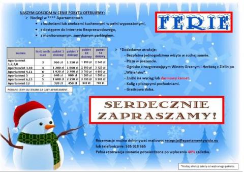 Zapraszamy Państwa serdecznie do spędzenia ferii zimowych w naszym obiekcie. Apartamenty nad Wisłą znajdują się w miejscowości Wisła –mieście o wspaniałych walorach turystycznych, położonym na południu Polski w górach Beskidu Śląskiego otoczonym przez malownicze pasma górskie i porastające je lasy. To doskonała lokalizacja na zimowy wypoczynek!