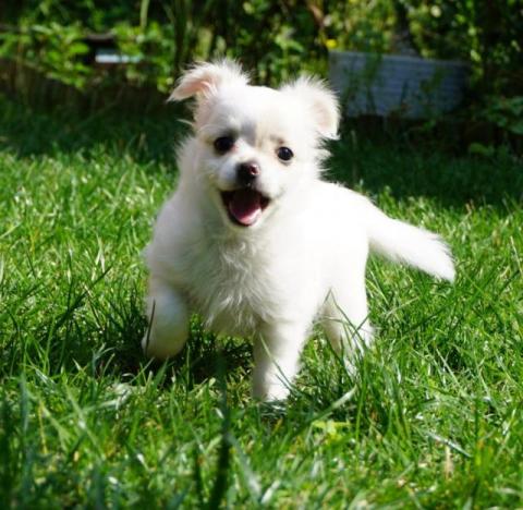 Szczeniaczek jest koloru białego z niewielkimi znaczeniami w kolorze jasnej kawy z mlekiem.