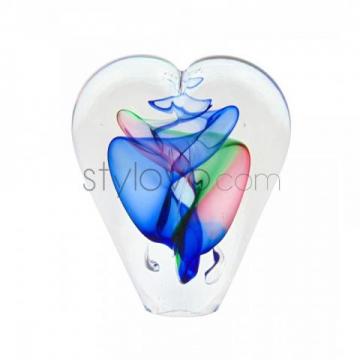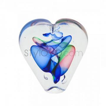 Przedstawiamy Państwu szklane serce. Z zewnątrz przedmiot jest pokryty szkłem bezbarwnym, natomiast w środku są zatopione barwne warstwy szkła. Całość jest utrzymana w pieknej niebieskiej tonacji.