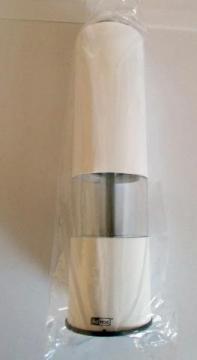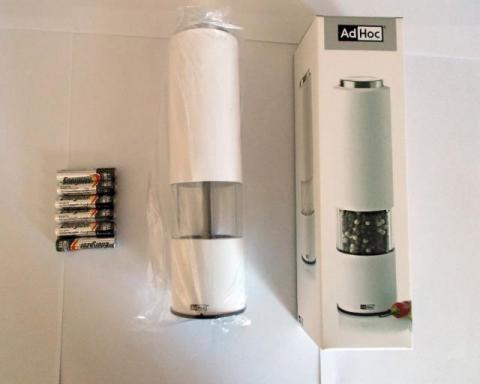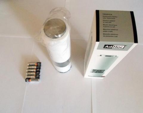 Nowoczesny młynek elektryczny do soli lub pieprzy AD HOC Tropica jest łatwy w użyciu – aby go uruchomić wystarczy nacisnąć przycisk zlokalizowany w górnej jego części. Młynek ten wykonany jest z wytrzymałego tworzywa sztucznego w kolorze białym z ceramicznym mechanizmem mielącym. Przezroczysta część pozwala na kontrolę mielonych przypraw. W dolnej części młynka znajduje się przesuwana blokada, która umożliwia zamknięcie otworu po mieleniu, aby resztki zmielonej przyprawy nie wypadały z młynka. Posiada regulację mielenia oraz wbudowaną diodę Led, która włącza się momencie mielenia oświetlając miejsce, na które zsypuje się przyprawę. Młynek zasilany jest 6 bateriami, które załączyłem w zestawie.